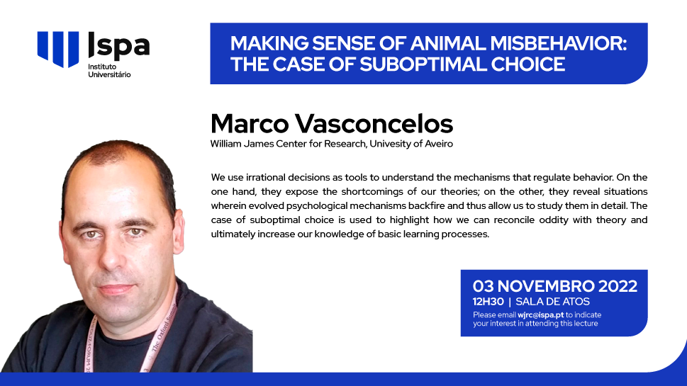 No próximo dia 3 de novembro às 12h30 na Sala de Atos do Ispa, o investigator Marco Vasconcelos vai dar uma palestra com o título Making sense of animal misbehavior: The case of suboptimal choice.