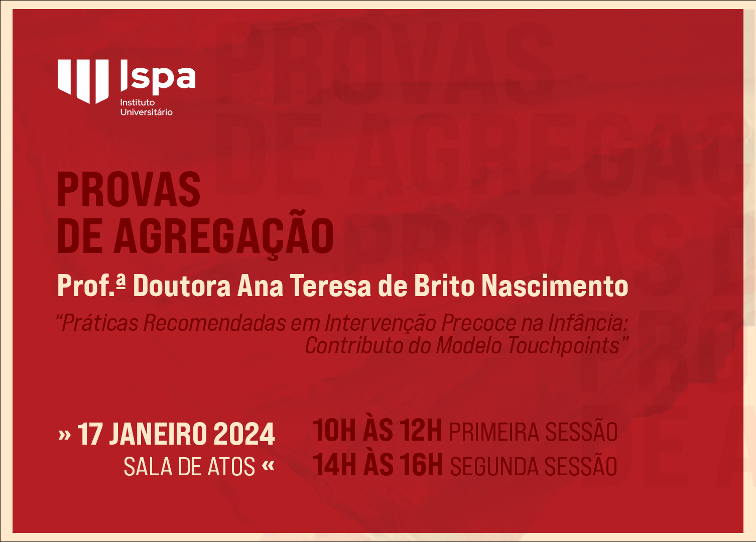 Realizam-se, no dia 17 de janeiro de 2024, as Provas de Agregação no Ramo de Educação, requeridas pela Professora Doutora Ana Teresa Correia de Brito Nascimento. As provas terão lugar na Sala de Atos, das 10h00 às 12h00 e das 14h00 às 16h00.