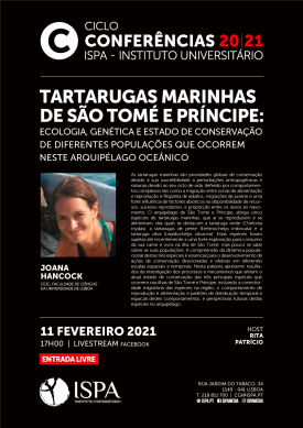 No âmbito do Ciclo de conferências ISPA – 2020/2021, Joana Hancock (Ce3c, Faculdade de Ciências da Universidade de Lisboa), dará uma palestra com o título Tartarugas Marinhas de São Tomé e Príncipe: Ecologia, genética e estado de conservação de diferentes populações que ocorrem neste arquipélago oceânico.