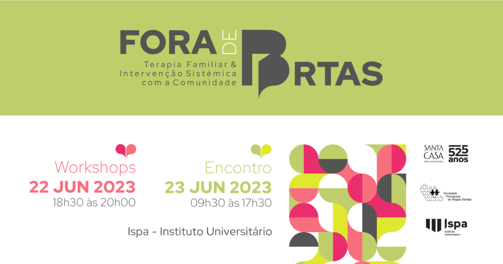 No âmbito do encontro Fora de Portas – Terapia Familiar e Intervenção Sistémica com a Comunidade, co-promovido pela Sociedade Portuguesa Terapia Familiar, Santa Casa da Misericórdia de Lisboa e Ispa – Instituto Universitário, realizam-se três workshops, no dia 22 de junho entre as 18h30 e as 20h, no Ispa.