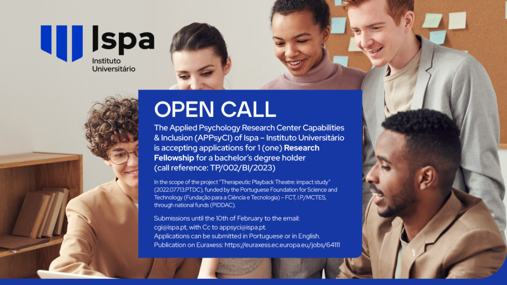 The Applied Psychology Research Center Capabilities & Inclusion (APPsyCI) of Ispa – Instituto Universitário is accepting applications for 1 (one) Research Fellowships for a bachelor’s degree holder (call reference: TP/002/BI/2023) in the scope of the project “Therapeutic Playback Theatre: impact study” (2022.07713.PTDC), funded by the Portuguese Foundation for Science and Technology (Fundação para a Ciência e Tecnologia) – FCT, I.P./MCTES, through national funds (PIDDAC).