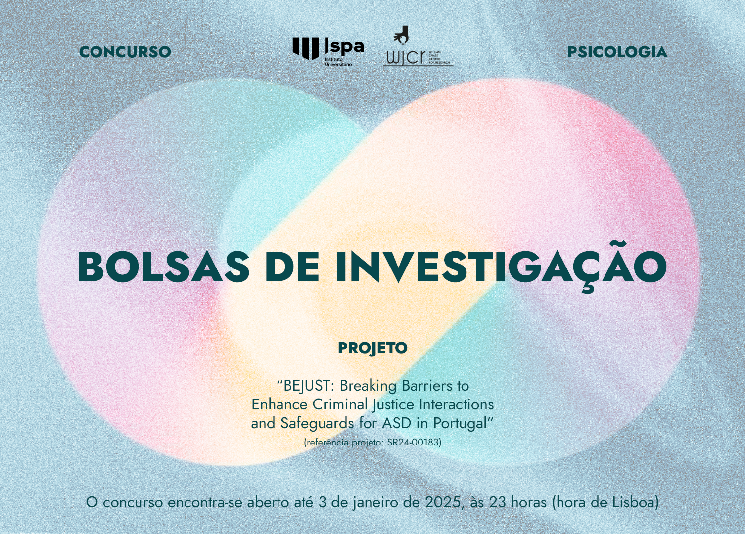 O Ispa – Instituto Universitário informa que está aberto o concurso para a atribuição de duas Bolsas de Investigação (referência WJCR/013/2BI/2024) no âmbito do projeto “BEJUST: Breaking Barriers to Enhance Criminal Justice Interactions and Safeguards for ASD in Portugal”. As bolsas, financiadas pela Fundação “la Caixa”, destinam-se a integrar atividades na Unidade de I&D William James Center for Research.