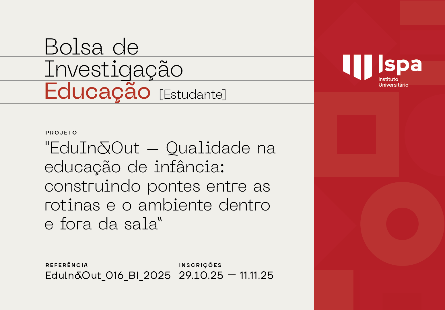 O Ispa – Instituto Universitário tem aberto, entre 29 de outubro e 11 de novembro de 2025, o concurso EduIn&Out_016_BI_2025 para a atribuição de uma bolsa de investigação no âmbito do projeto “EduIn&Out – Qualidade na educação de infância: construindo pontes entre as rotinas e o ambiente dentro e fora da sala”. O projeto é financiado pela Fundação para a Ciência e a Tecnologia (FCT) e desenvolvido no centro de investigação EDUNOVA.ISPA.