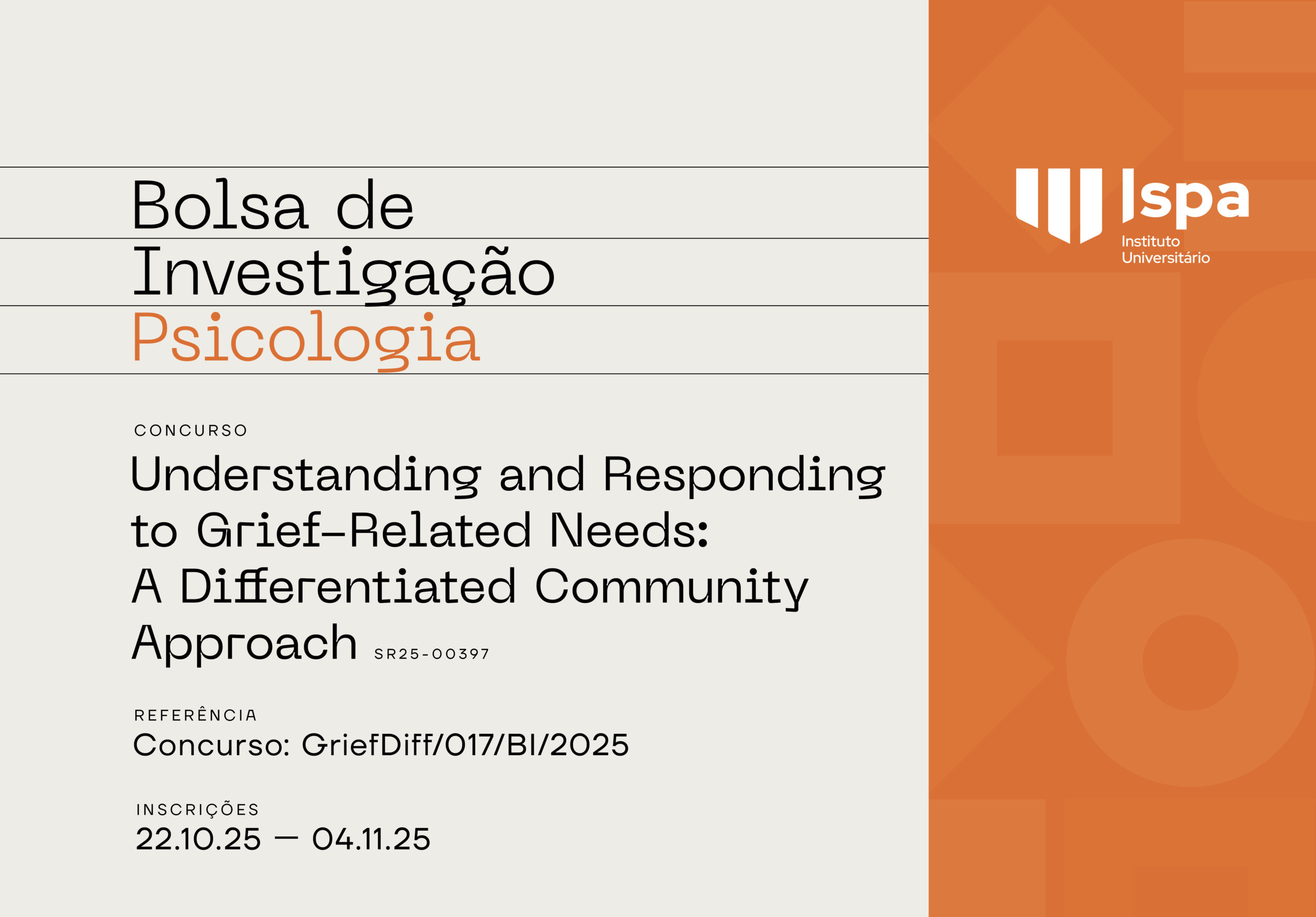 O Ispa – Instituto Universitário tem aberto, entre 22 de outubro e 4 de novembro de 2025, o concurso GriefDiff/017/BI/2025 para a atribuição de uma bolsa de investigação no âmbito do projeto internacional “Understanding and Responding to Grief-Related Needs: A Differentiated Community Approach”. A investigação será desenvolvida na unidade APPsyCI – Applied Psychology Research Center Capabilities & Inclusion, com financiamento da Fundação “la Caixa”.